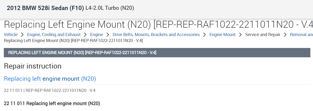 The condition of the engine mount cannot be reliably determined on the basis of an optical inspection. In order to ensure customer satisfaction, it is therefore recommended to replace both engine mounts to avoid repeat repairs. In a warranty case, always replace both engine mounts. Check out the images (below). Let us know if you need anything else.