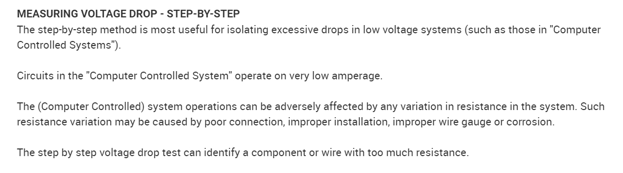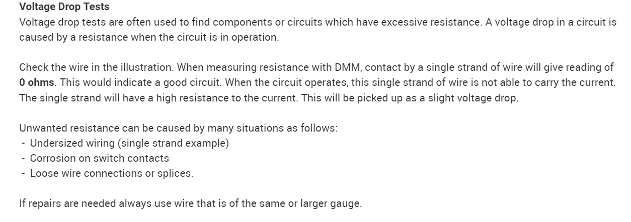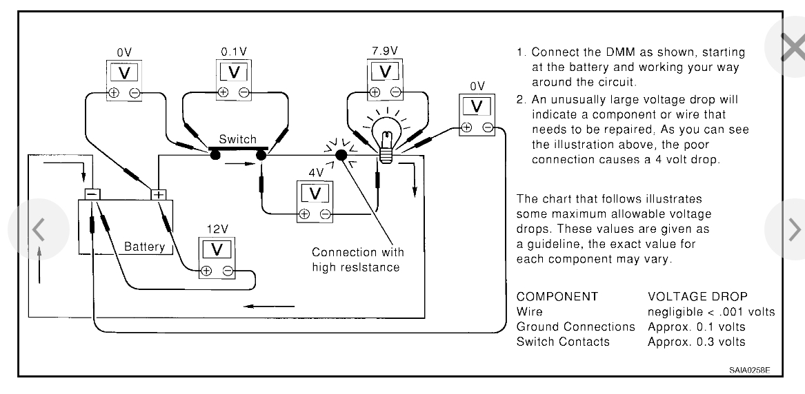 Okay, so to test the battery you can take a voltage reading across the terminals with a Digital Multi-meter (DMM). A healthy battery should return a reading of 12.6 volts. 12.45 volts is 75%, 12.3 volts is 50%, 12.15 volts is 25% charged, and 12 volts and under is technically considered dead. This, of course, is a quick test, the proper way to test is with a load on the battery, but it will give you some idea of where your battery's charge is at. In the diagrams down below I have included a wiring diagram for the starting system of your vehicle. With the help of an assistant, and some jumper extension wires, could you do a voltage drop test on the white/brown wire going from the starter to the battery. I have included a guide explaining how to do a voltage drop test in the diagrams down below for you as well. This test will give an accurate reading as to the health of this wire which supplies the starter with battery voltage. Also check the connections at the battery and starter for any corrosion, and make sure that they are clean and tight. Please go through these guides and get back to us with what you are able to find out.