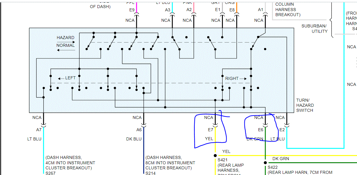 If it is only the rear lights, the problem has to be near the switch. I attached a portion of the wiring schematic and circled two wires. Each wire goes to a different signal on the rear of the vehicle. What I need you to do is check to see if there is power to both wires at the same time regardless if you select left or right. If you find that at the switch only one side at a time gets power, then we know the short is after the switch. If you get power from both sides of the switch,