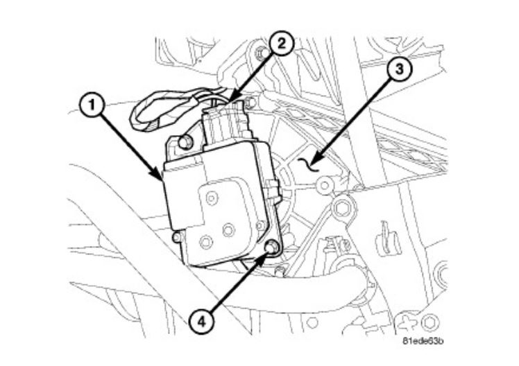 3. Remove the two screws (4) that secure the blend door actuator (1) to the left side of the HVAC air distribution housing (3).