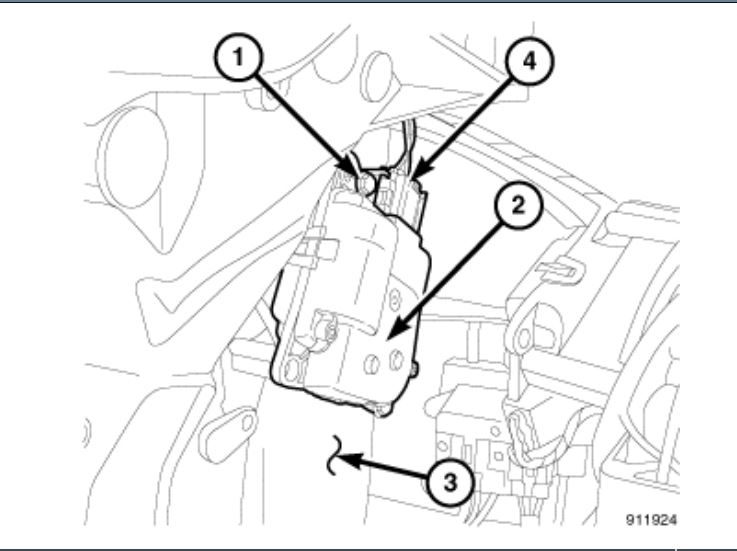 4. Remove the two screws (1) that secure the blend door actuator (3) to the right side of the HVAC air distribution housing (4).