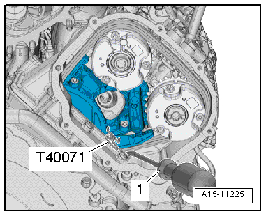 Press the right camshaft timing chain tensioner guide rails in as far as the stop using a screwdriver -1- and secure the chain tensioner with a -T40071- .