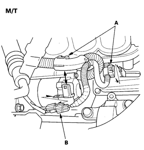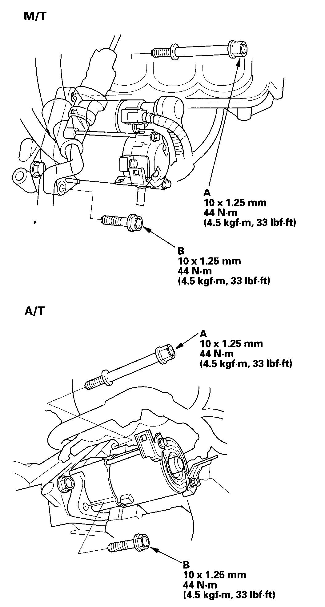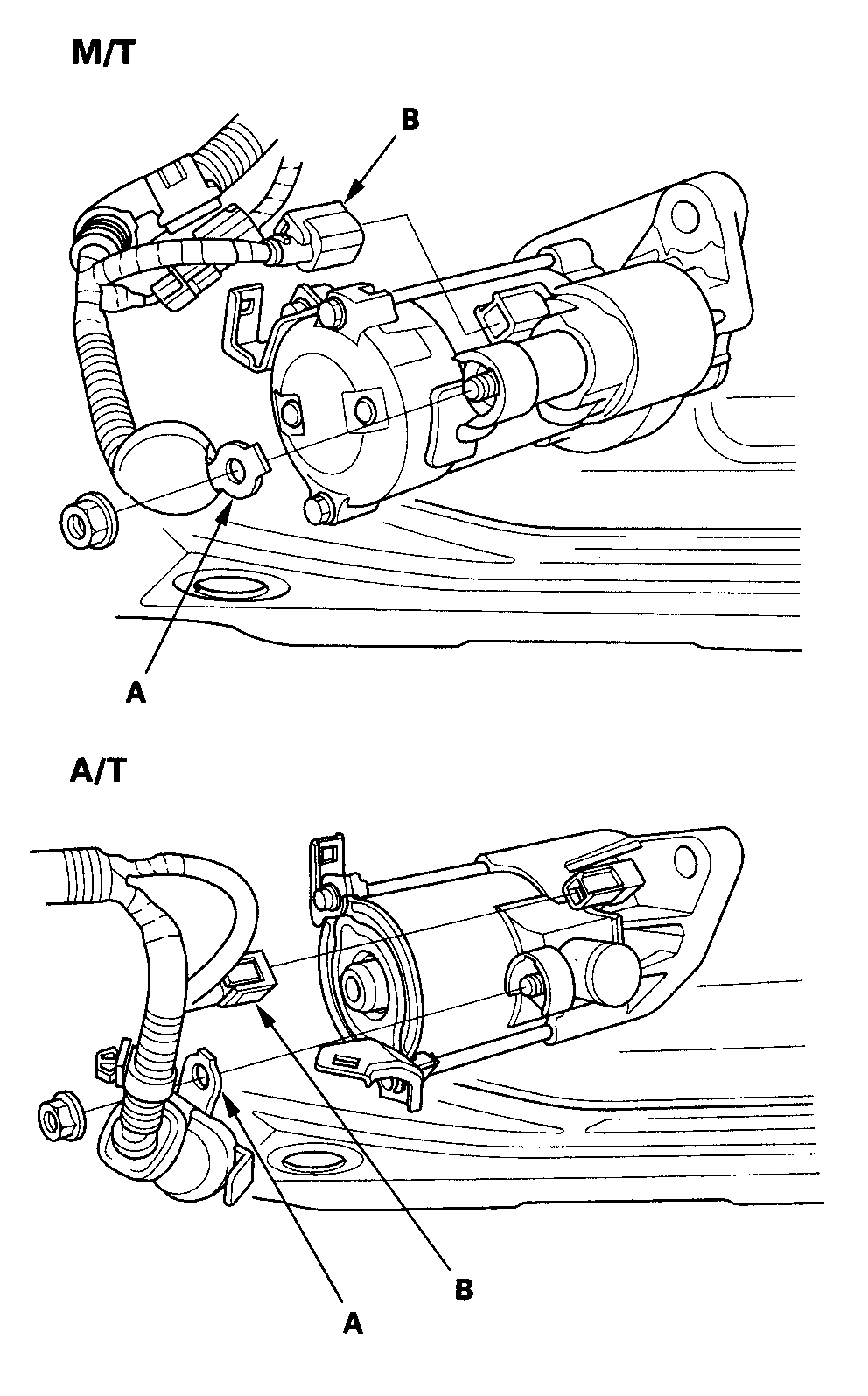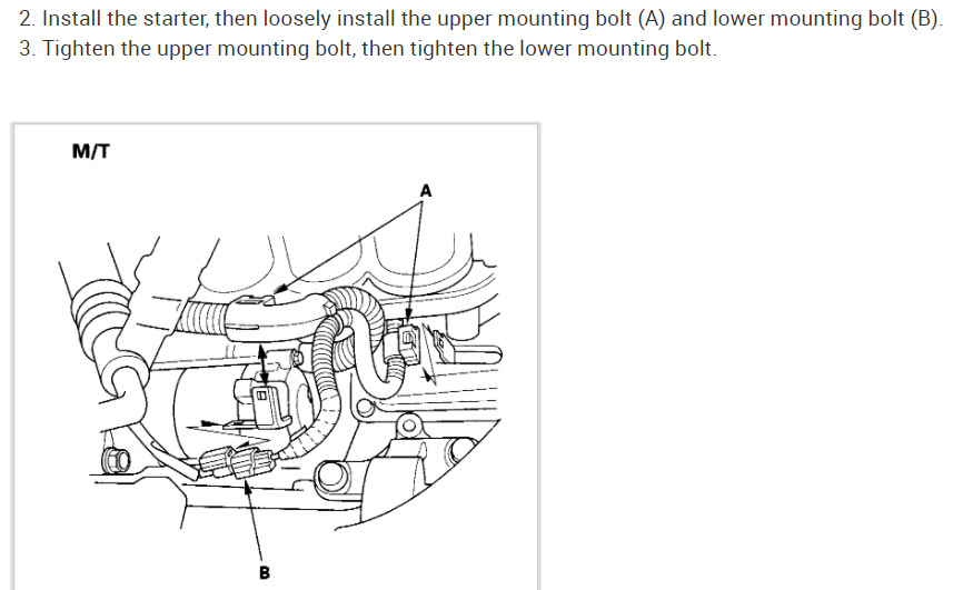 2. Install the starter, then loosely install the upper mounting bolt (A) and lower mounting bolt (B).