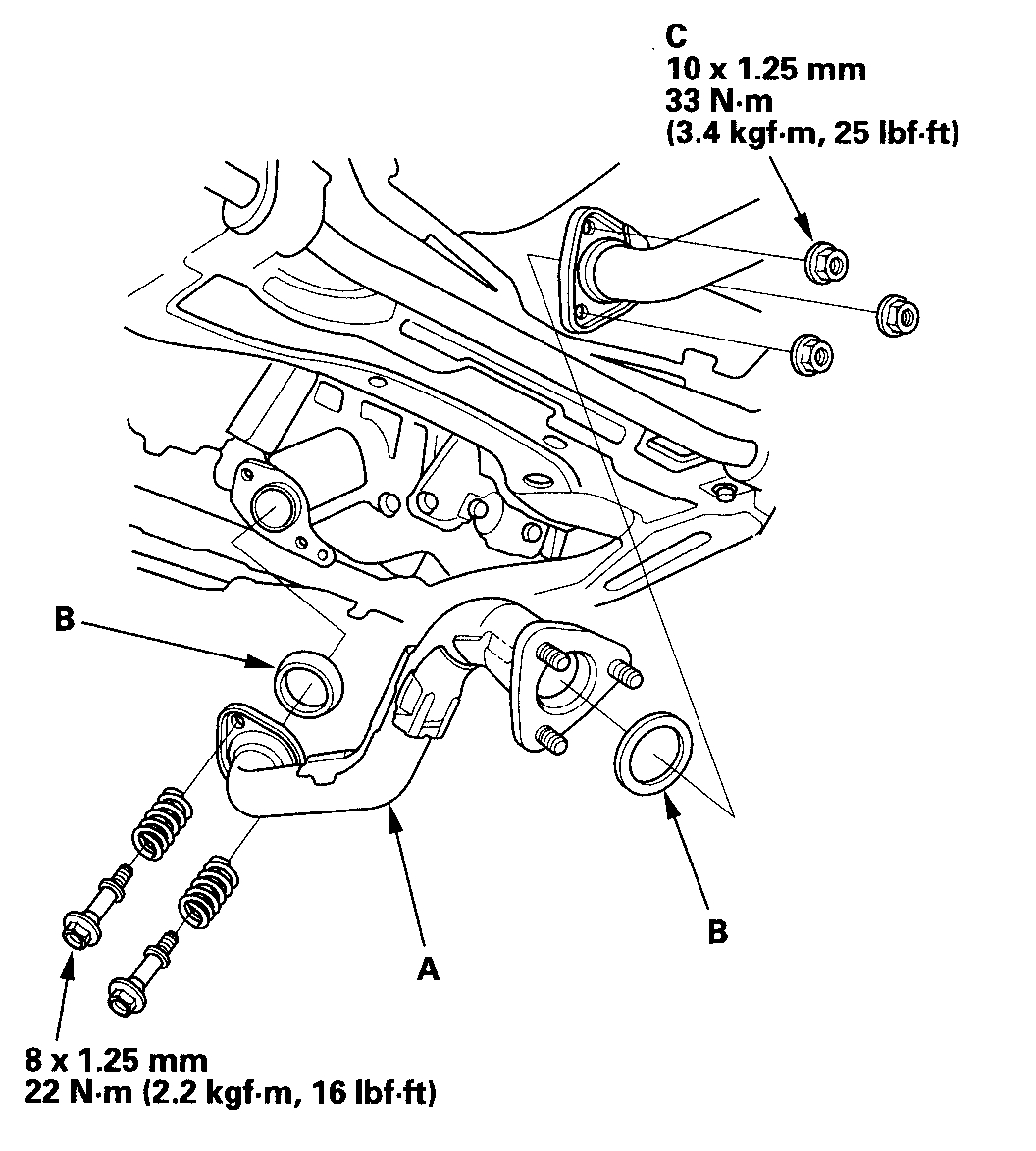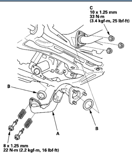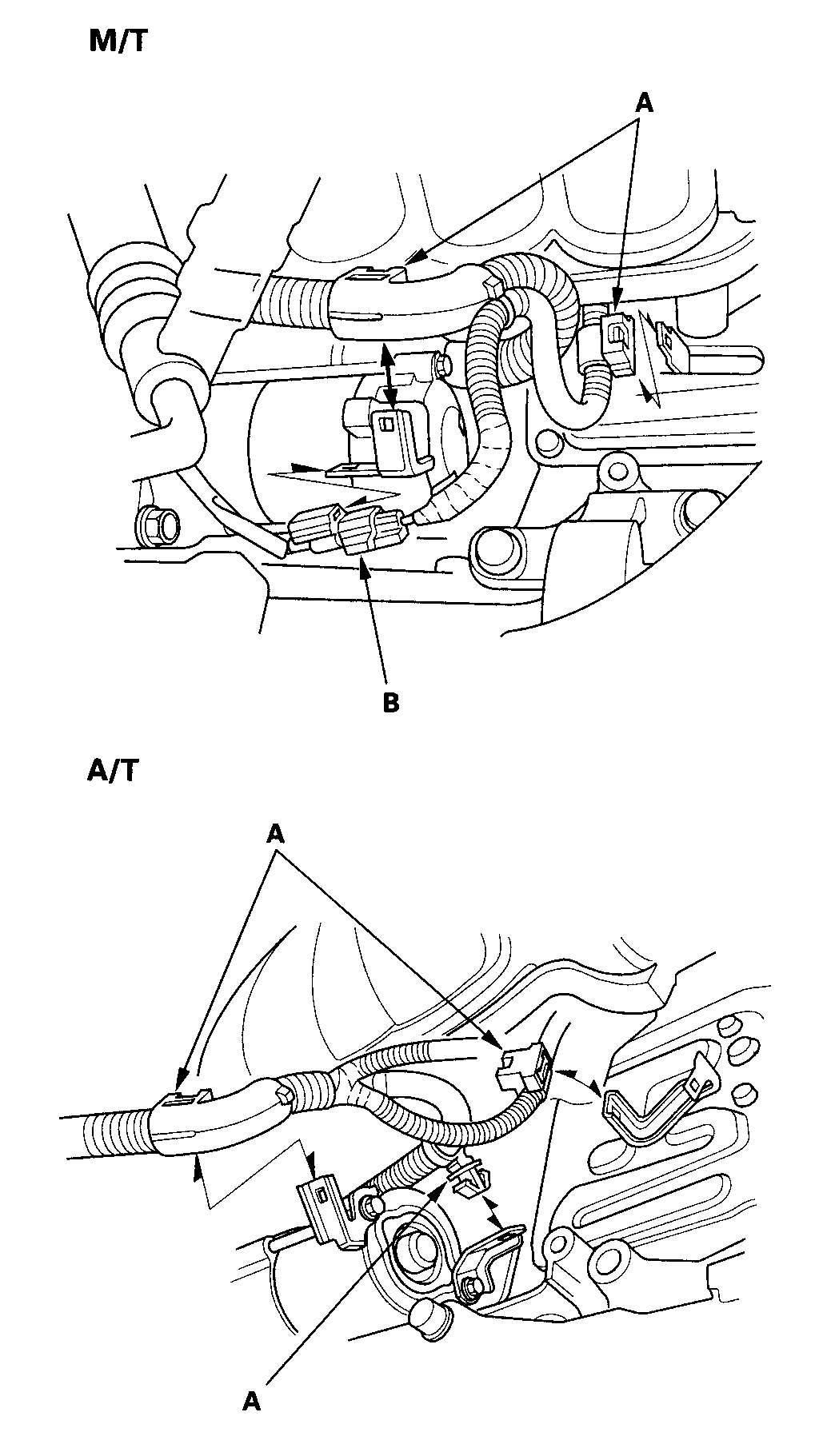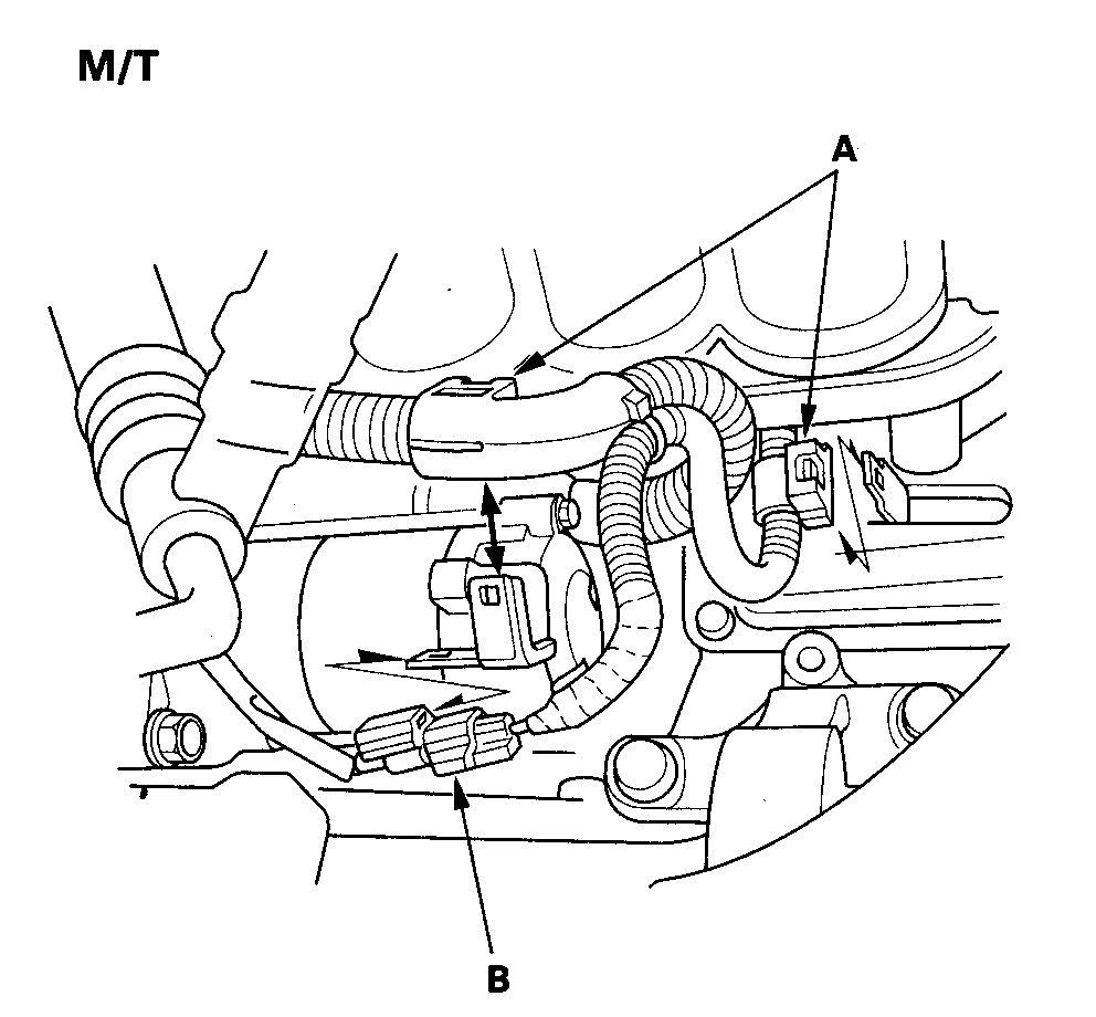 2. Install the starter, then loosely install the upper mounting bolt (A) and lower mounting bolt (B).