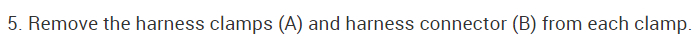 5. Remove the harness clamps (A) and harness connector (B) from each clamp.