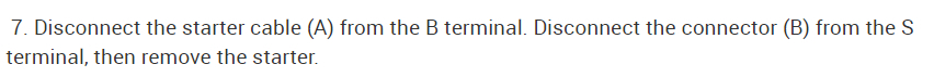 7. Disconnect the starter cable (A) from the B terminal. Disconnect the connector (B) from the S terminal, then remove the starter.