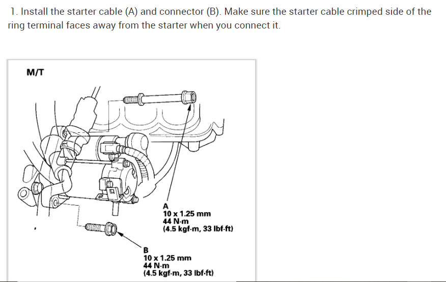 1. Install the starter cable (A) and connector (B). Make sure the starter cable crimped side of the ring terminal faces away from the starter when you connect it.