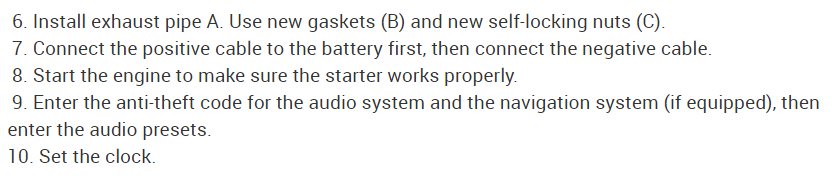 6. Install exhaust pipe A. Use new gaskets (B) and new self-locking nuts (C).