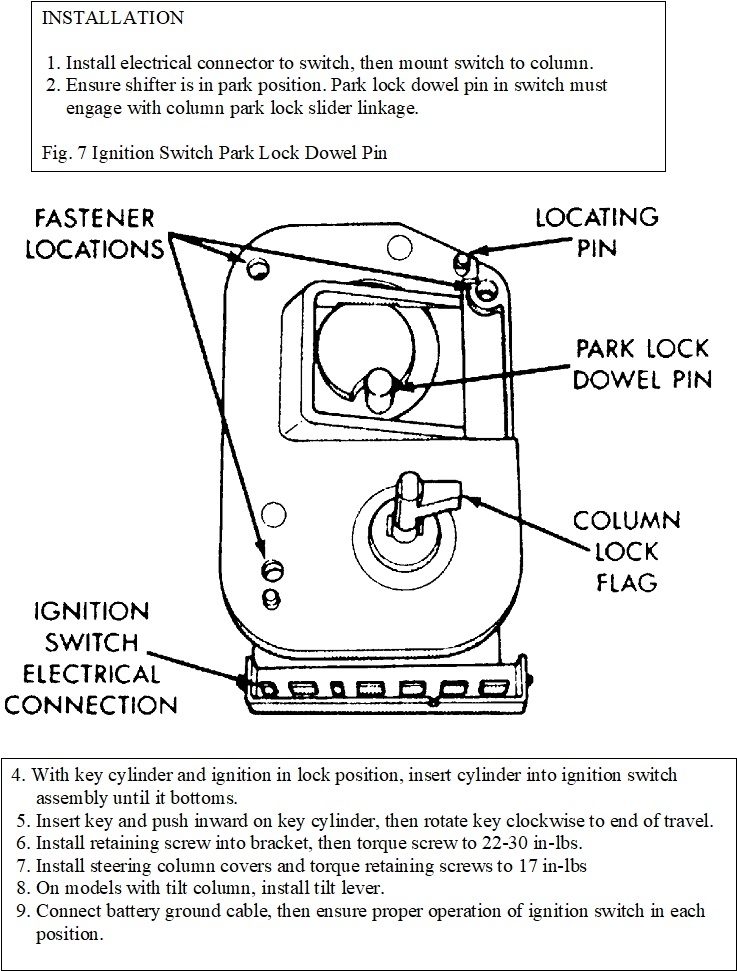 Drawings four through seven show the steps to remove the ignition switch. It includes removing the cylinder from the old switch, to which I must add a couple of comments. In the fifth drawing, they show the roll pin that must be pressed in to release the cylinder. It isn't always as easy as that. Sometimes you have to wiggle and twist it gently before it understands you want it to come out. This only adds a few seconds to the job, but it can put you into a panic the first time it doesn't work right away. The key has to be in the cylinder to do this. For my last comment of value, in the last drawing, step 5, they tell you to turn the ignition switch to the "crank" position, but they don't tell you why. Doing that pushes the roll pin out to its retaining position to lock the cylinder in place.
