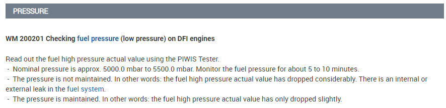 I've attached a picture below with the fuel pressure specification. You should verify this first. Does your Foxwell have the same capabilities as the PIWIS tester? Let us know and we'll go from there. I've attached the specification below. Hope this helps and thanks for using 2CarPros.