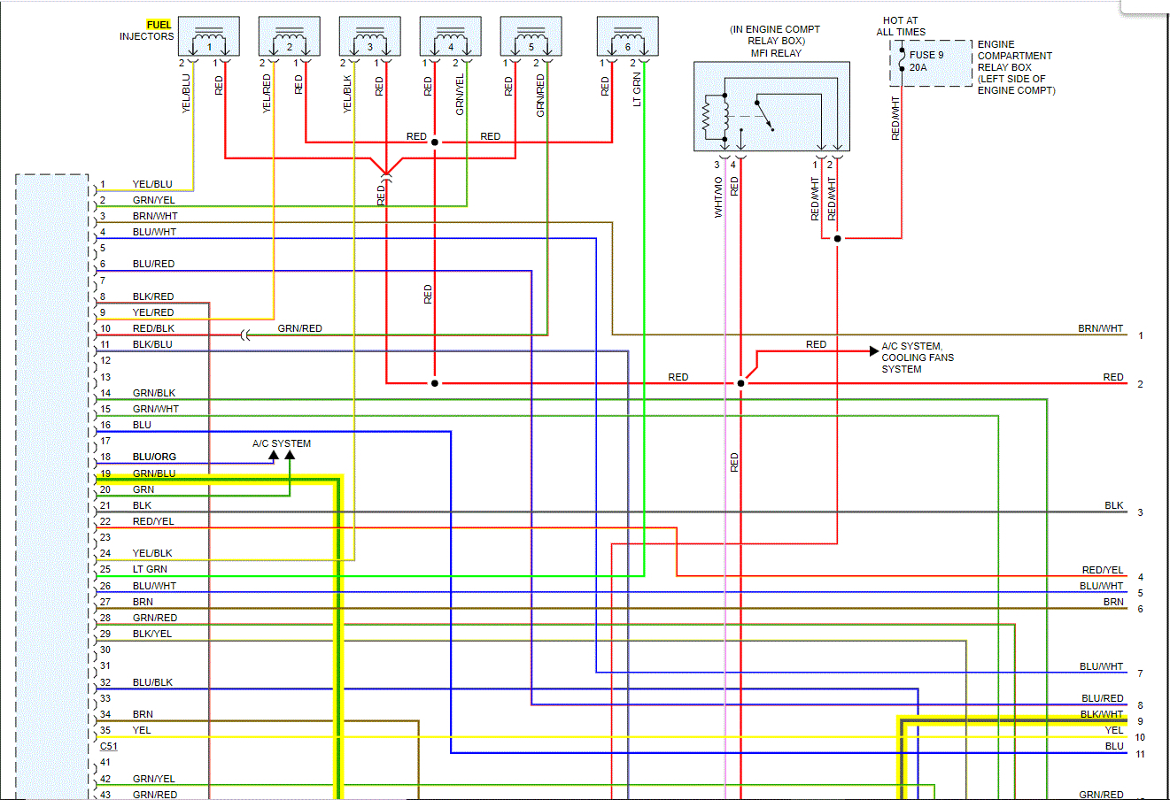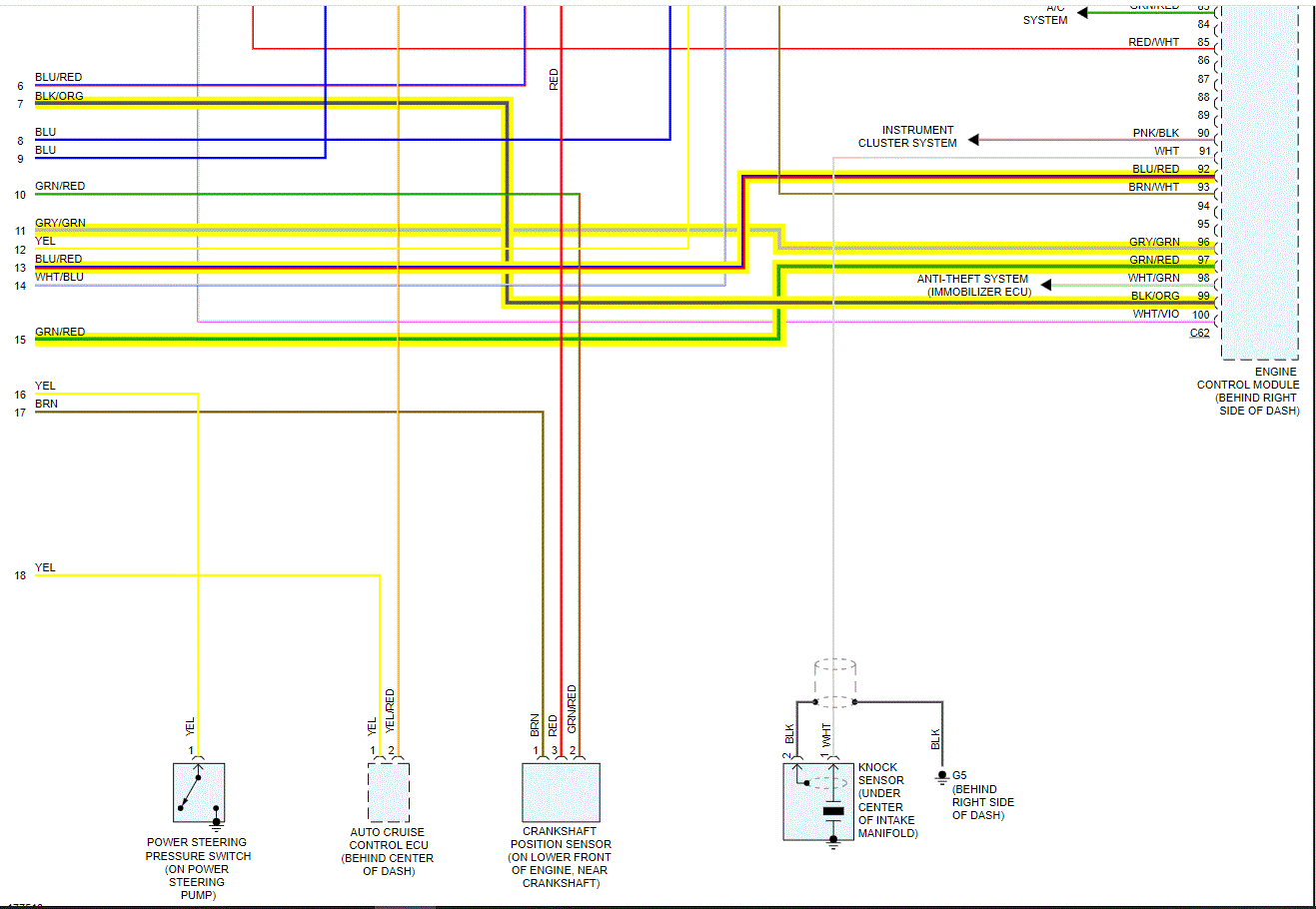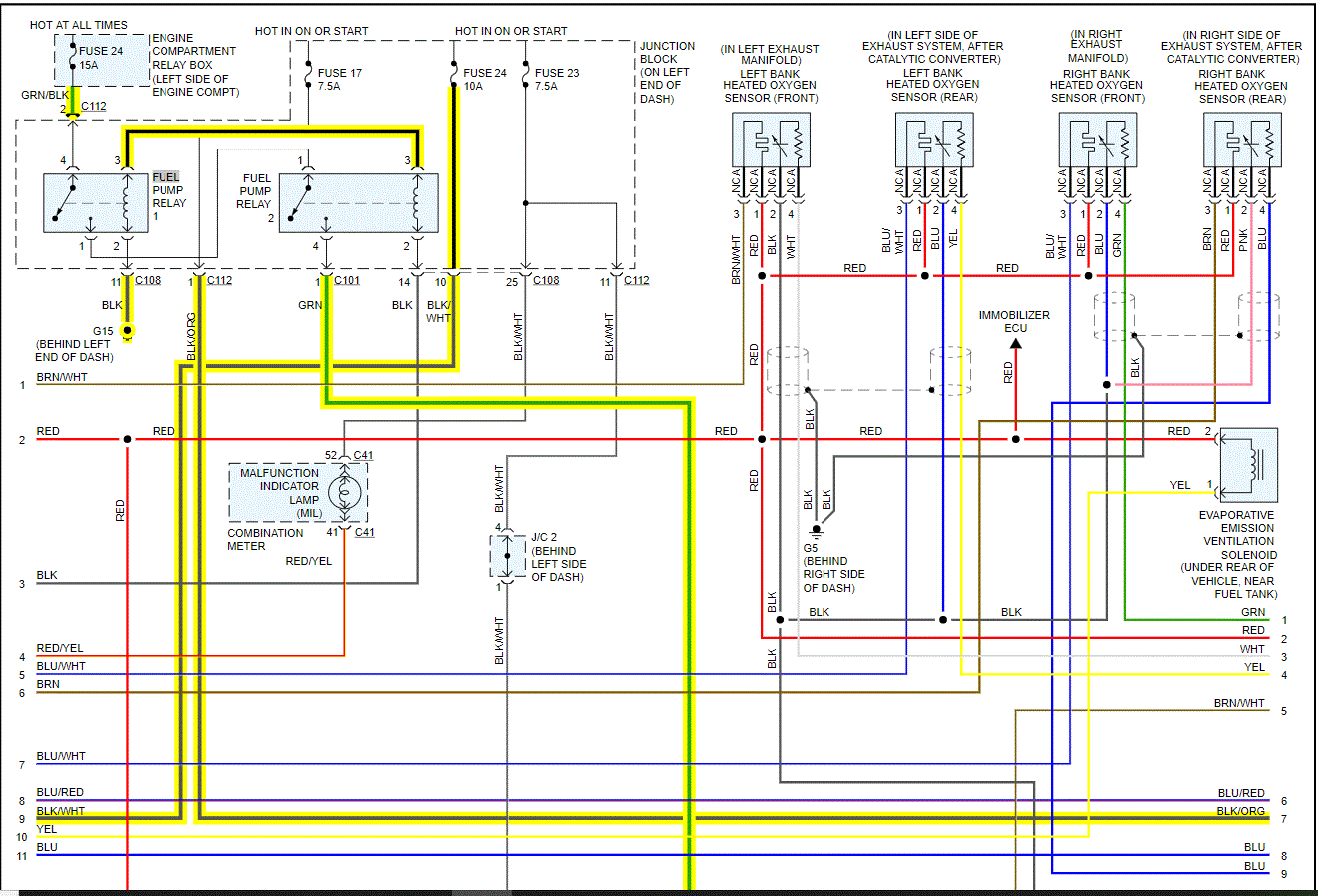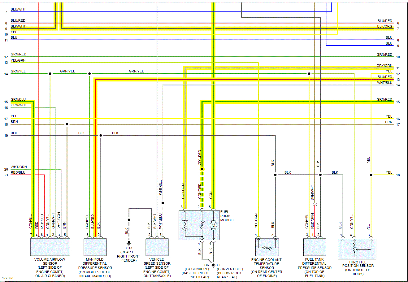 I attached the entire wiring schematic for the powertrain management system below. I highlighted the fuel pump wiring as well as the fuel tank pressure sensor.