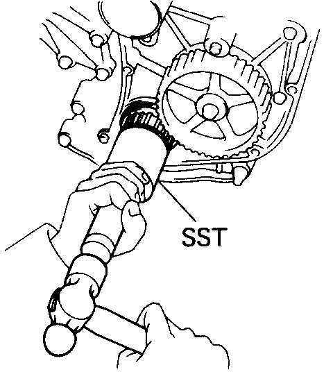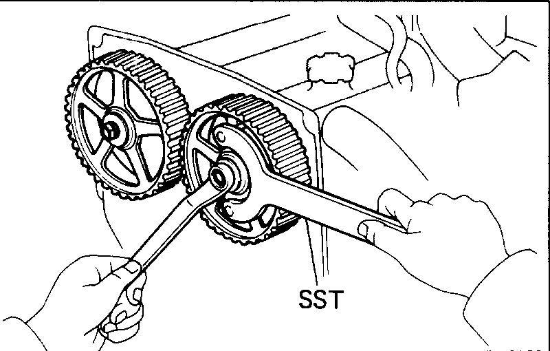Using SST to hold the pulley, remove the pulley bolt, timing pulley and match pin. SST 09278-54012
