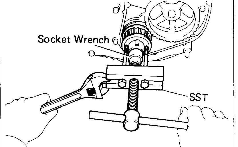 Using SST and socket wrench, remove the crankshaft timing pulley. SST 09213-60017