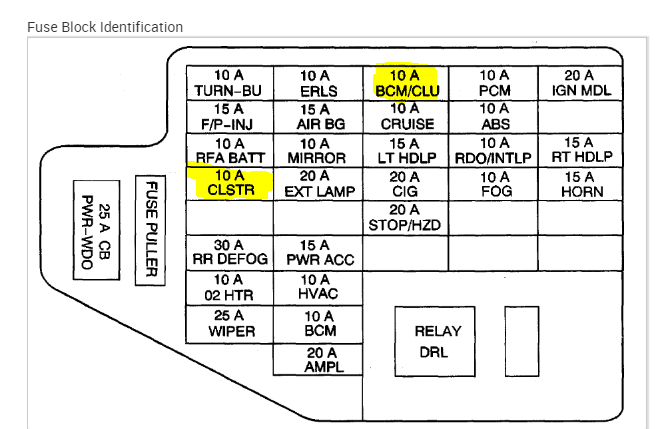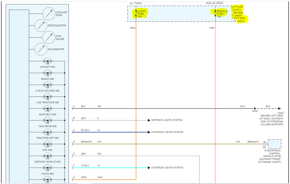 I attached the wiring schematic below for the cluster. I highlighted the fuses that are located in the instrument panel fuse box.