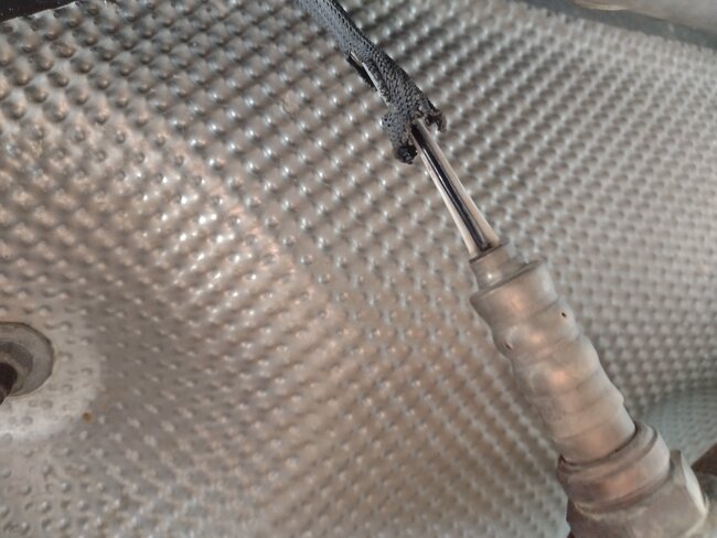 I ordered an infrared thermometer and should be here Friday. In the meantime, I found the nuts missing on the connector flange of the muffler, the one on the engine side of the muffler. Found replacements and am putting them on and tightening them up. Had a bad exhaust leak with those off. I also noticed that the o2 sensor wires have one wire with no insulation. Sheathing covering the wires disintegrated for about 3 or 4 inches and wires exposed. All have insulation but one. I've enclosed a photo. Is this normal?