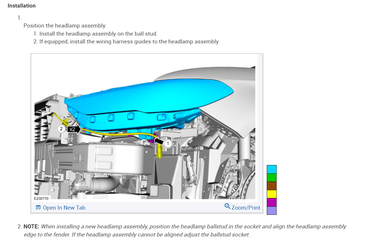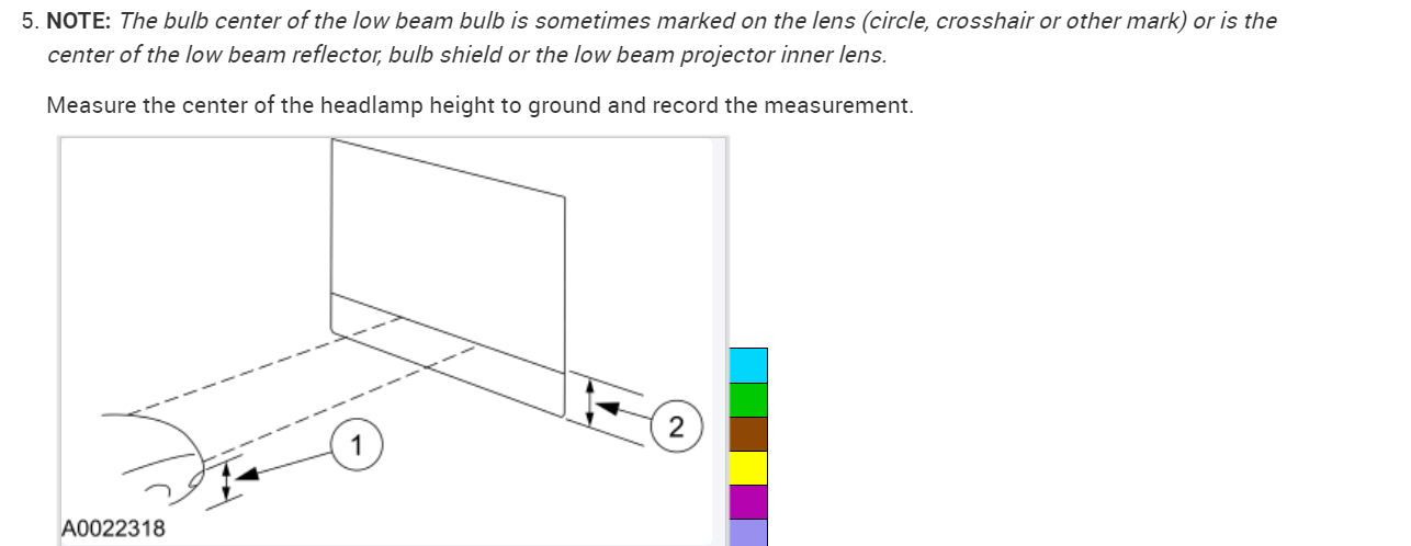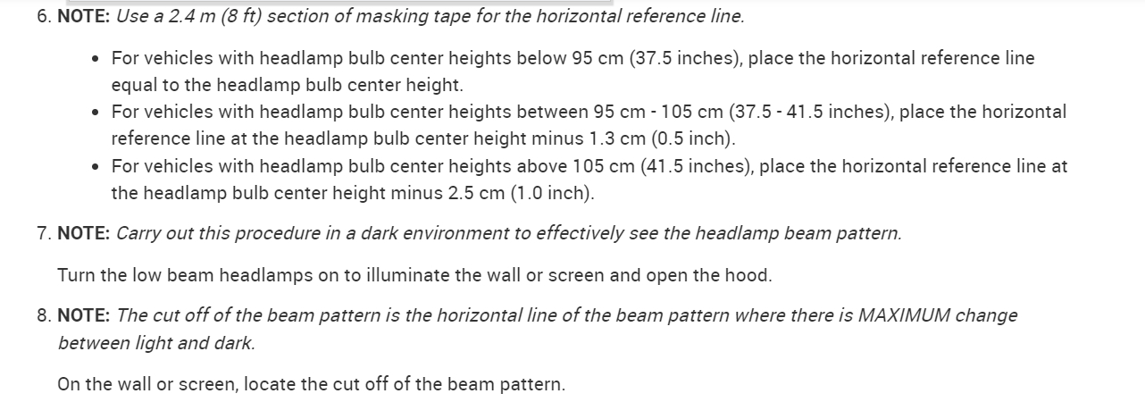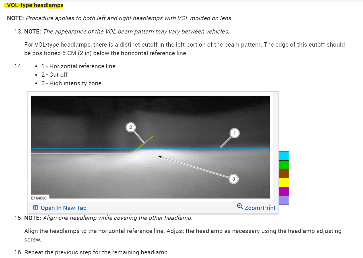Diagrams 19 to 22,23,24 are for Headlamp Adjustment. The Ford video Link is below. It leads to a video download. I just tried the link, so it is still active. But on diagrams 23 and 24 service info mentions VOR and VOL headlamp assemblies. They appear to be different types of molded lens for each.