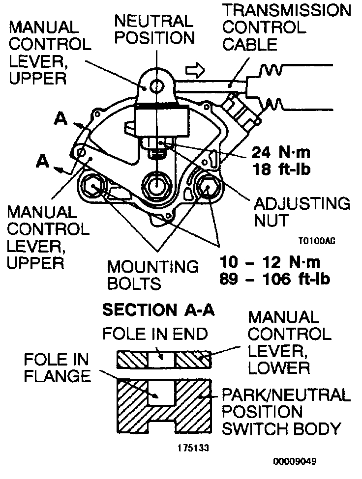 4. Loosen the park/neutral position switch body mounting bolts and turn the park/neutral position switch body so the hole in the end of the manual control lever and the hole (cross section A-A in the figure on the left) in the flange of the park/neutral position switch body flange are aligned.