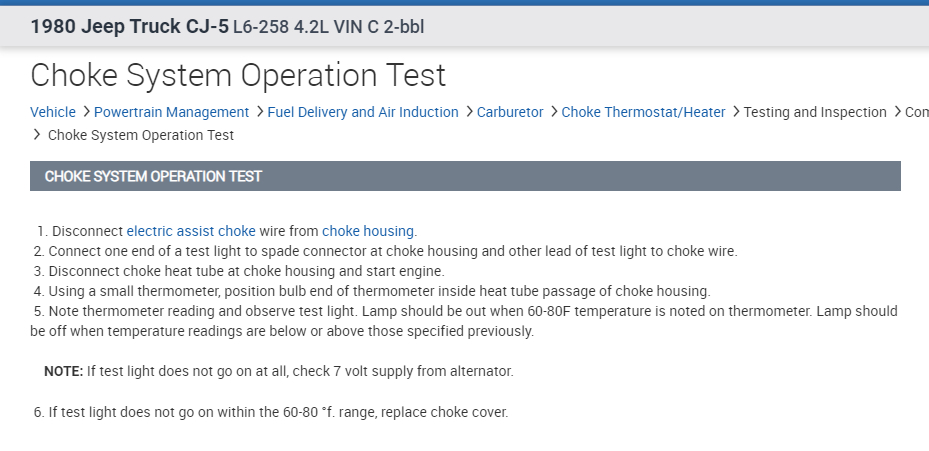If you want, I attached the directions below for testing the choke. Take a look through them and let me know if you are comfortable performing the directions. Also, we have a guy on here that knows these vehicles inside out. I'm hoping he jumps in if he has other ideas.
