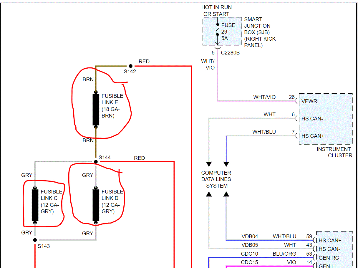 Now, if you find there is no variation between testing when the engine is off and when it is running, I need you to check for power at two locations on the alternator. Both are red wires. If we first find the alternator isn't doing anything, I suspect you will find no power to one of the wires I mentioned resulting from a blown fusible link.