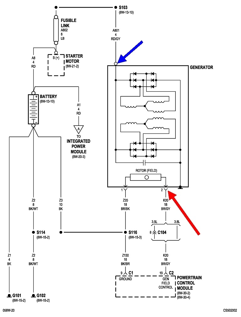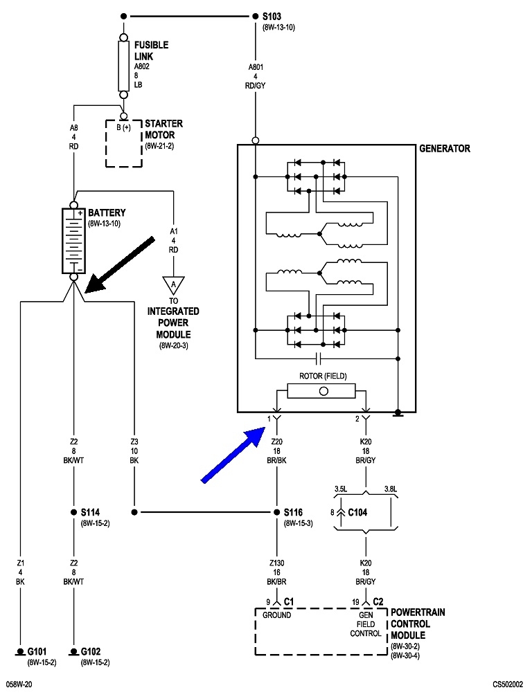 For your wire, a good suspect is a corroded splice S116 or that wire is corroded off at the terminal in the connector or at the battery cable. We can narrow down the list of suspects even more if we look at the wire designations. Right next to my blue arrow, the wire is listed as, "Z20 18BR / BK. "Z" circuits are ground wires or circuits. This is circuit "20" which just differentiates it from other circuits. It's an 18-gauge wire which is very small, indicating you don't expect it to carry very much current. It's color is brown with a black "tracer" or stripe.