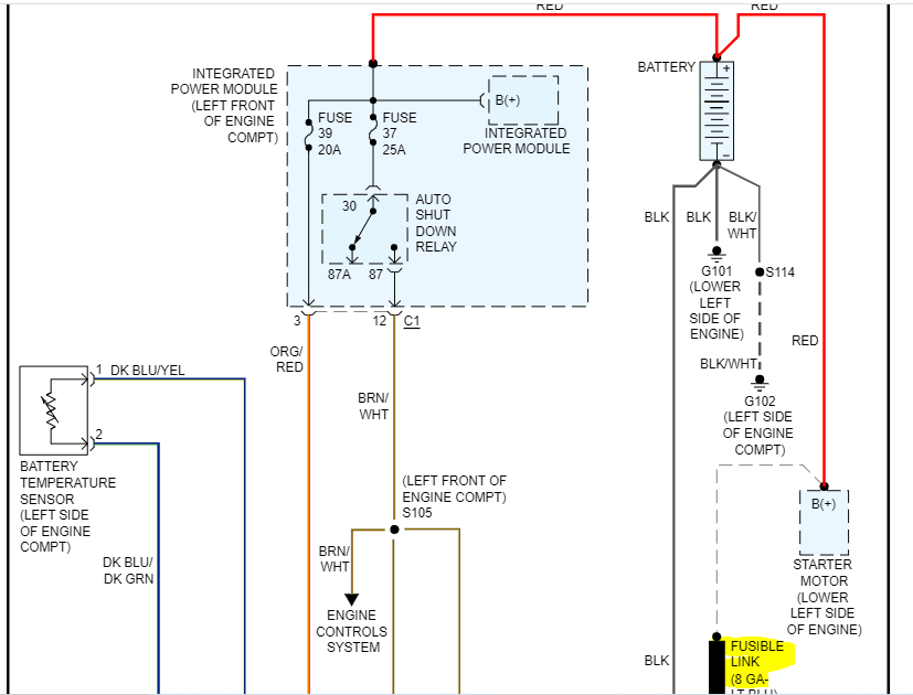 More importantly, it's now a ten-gauge wire which is pretty large. A lot of current is expected to flow through that section, and with other circuits not shown here, we have to assume that current flows through the unidentified splice, then to a number of other systems. Since there's no symptoms from other things not working, we can assume this ten-gauge part of the wire is okay. That leaves the section between the two splices as the best suspect.