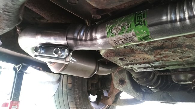 Done. Except for the one smaller diameter clamp I got under there and couldn't see or feel any leaks except drivers converter to y pipe..That new pipe smell though. I'll drive it fir swhile then get under there in a werk see if I csn tighten it down. It's very pretty and shiny under there. I will post pics in a few hrs omw to work.