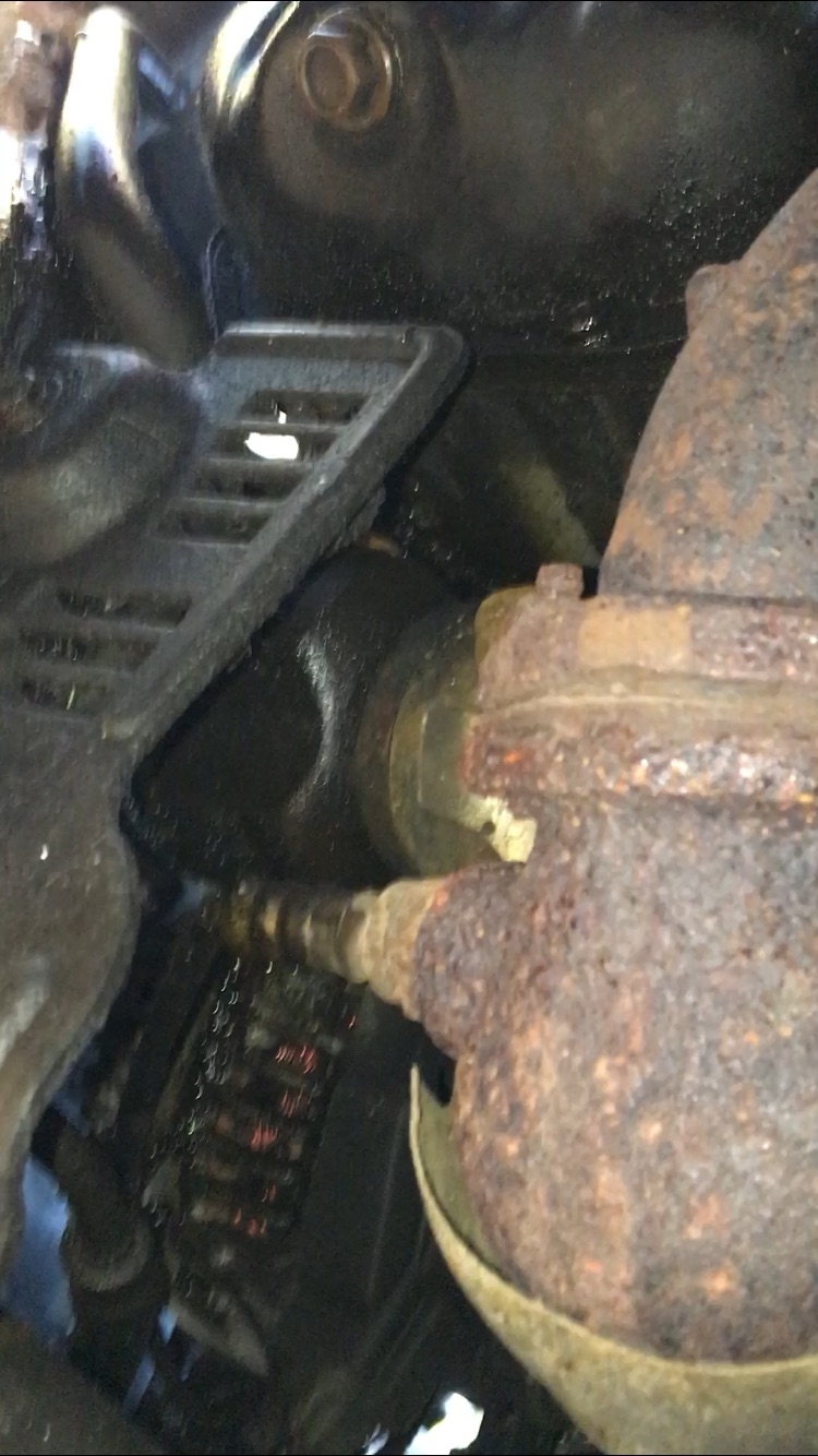 Perhaps the green I saw is dry, even better. And the oil just seeps, it's no leak onto pavements. I should've put some spray to loosen the rusted bolts while I was under there. I really wanted you to see the video. It's like a fascinating whole, new world underneath there, lol. Because there is little wiggle room and that sensor is not budging, I will take to a shop where the lifts come in handy. I also dropped my 12mm socket down in the engine. I have to fish out!