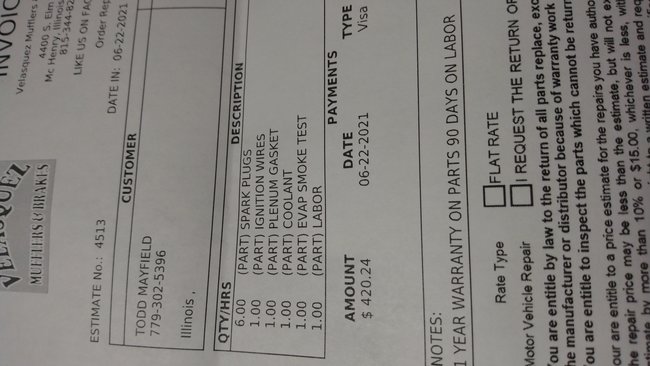 That's great news. Is it running properly now? It looks like the intake was leaking since they replaced that gasket and then a basic tune-up, plugs and wires. Is that correct? Is there anything they did other than testing?