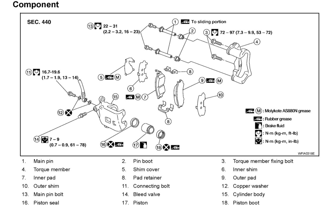 1. Apply Molykote AS880N grease between pad plate and shim, shim and shim cover, and shim cover and piston.