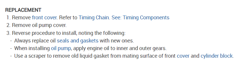 The oil pump is behind the front timing cover and you will need to remove the oil pan as well, here are the instructions to do so in the images below. Also make sure you clean the oil pan from deburis. Use new gaskets when you reassemble. Check out the images (below). Let us know if you need anything else.