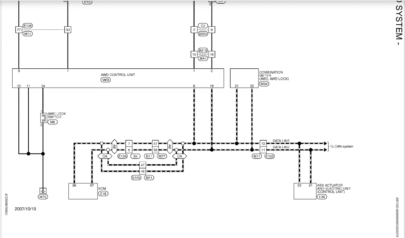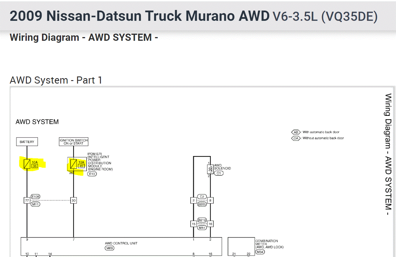 I attached the wiring schematic below for the AWD circuit. I highlighted two fuses I need you to check first. I highlighted them in pic 1. For some reason, my manual isn't showing me the location of the fuses, so I need you to check under the fuse box cover for a legend or in the owner's manual.