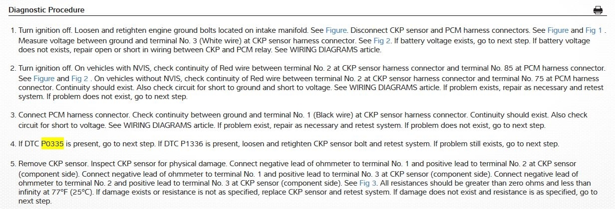 As far as what the codes mean, they both are pointing to problems with the crankshaft position sensor or its circuit. I am attaching ProDemand's information concerning the P0335 code in the images below. The P1320 code specifically says to solve the P0335 code first, so we will deal with that later if needed. Also, I understand that you do not necessarily have all of tools needed, so do what you can for now.