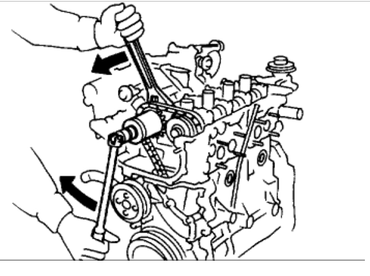 7. Loosen timing belt tension lock nut and rotate tension clock- wise. Then tighten tensioner lock nut.