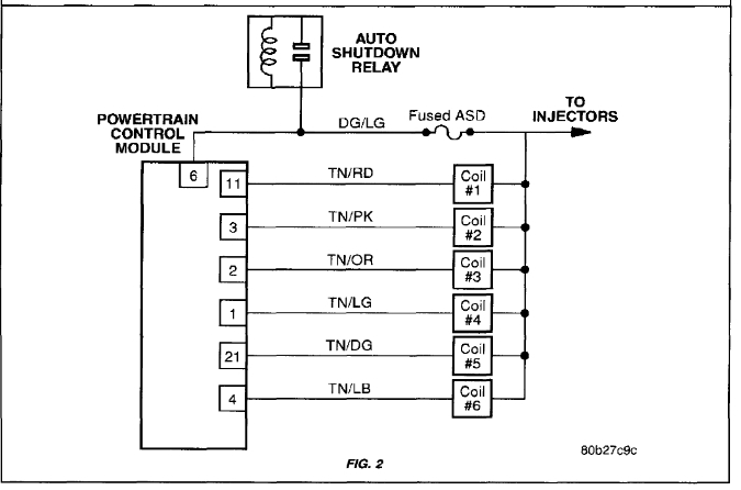 The next thing is to see what the automatic shutdown, (ASD) relay is doing. You've already been on those test points. Use the wire that is the same color at every injector and at the positive of the ignition coil(s). That's usually a dark green / orange wire. Easiest is usually to back-probe through the rubber seal at an injector. You can also use either smaller terminal on the back of the alternator. A test light works best for this because digital voltmeters usually don't respond fast enough. If you can prop the light so you can see it from inside, do that, otherwise you'll need a helper to run the ignition switch.