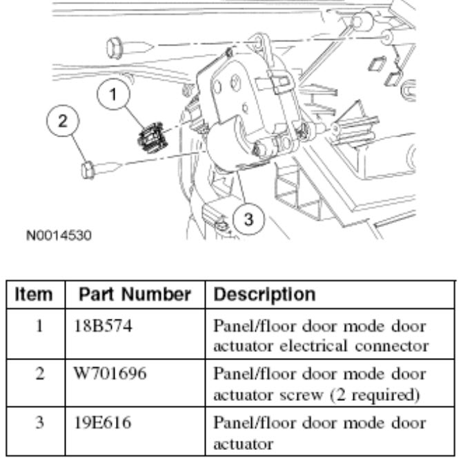 turned key to on powered up air conditioner set to max air conditioner unplugged floor/panel actuator several time, the third time it calibrated itself, and plows air out of front vents, fixed for now, someone has been to this actuator before. it is a used car to me, the plug no longer has the red safety clip on it. part your looking for will be left hand panel/floor 19E616. see image.