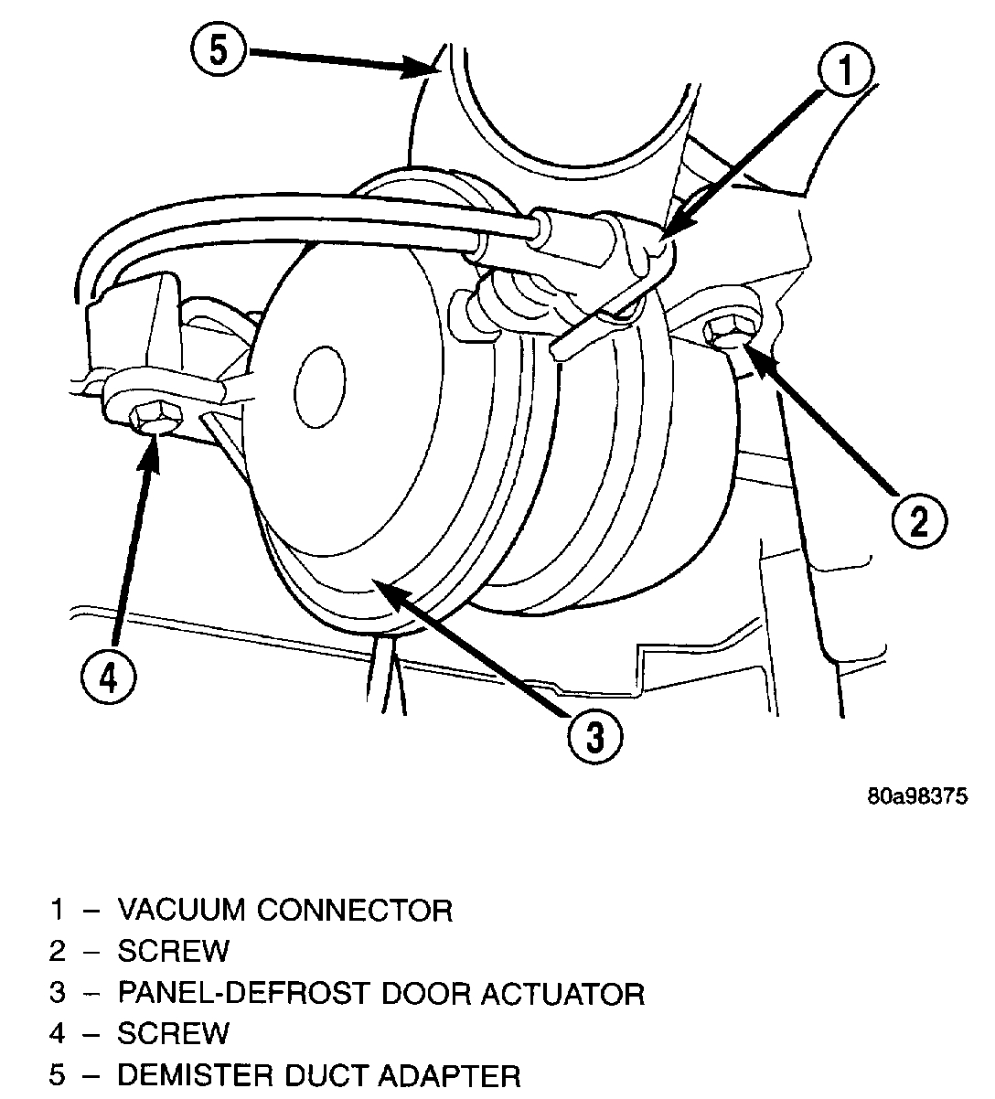 7. Reverse the removal procedures to install. Tighten the panel-defrost door actuator mounting screws to 2.2 Nm (20 in. lbs.).
