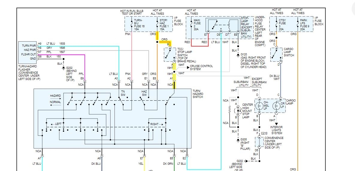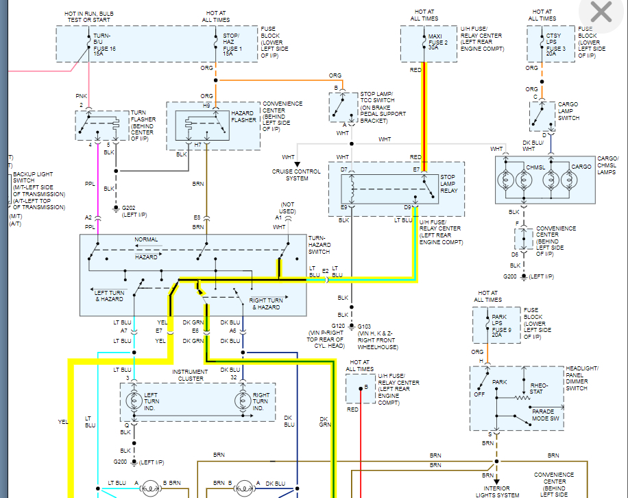 Typically I can figure things out on my own but this has me completely stumped. So I replaced my turn signal switch on the column. While I was under the dash I noticed the wires that run to the brake switch had broken off right at the connector. So I pulled that about six inch wire harness out. Found a wire schematic online and wired it back using that schematic. These wires are labeled abcdef on both ends on each connector. Should those be hooked in with a-a b-b c-c and so on or does that not matter? Also when brakes are applied following the schematic and the a-a b-b both ways when brakes are applied turn on the back up lights. There is also a white wire that runs from the third brake light to the rear (no one seems to know why this wire is there so let me explain and make it very simple. It is there for a topper light splice and has only been added if the vehicle was ordered with a topper from day 1 the vehicle was originally purchased. Or added in later on for a topper) so with that being said the wires that run from the front dark green and yellow being stop/turn/hazard lights, brown is tail lamps/license plate lights, white is ground (do not mistake this white wire for the added topper white wire you will fry the fuse or wiring, best to label that wire and tape it off). My problem is this. I have power going to the rear for brake lights but it is going through the light green wire (back up light wire) all my other lights operate as they should. Turn signals work, hazards work, license lights work, back up lights work, cargo lights work, head lights work hi and low beam. Everything works besides the brake lights. I had the brake switch tested. Tested fine. Checked the six inch wiring for continuity as I read the white wire on this harness gets broke up by the column closer to the turn signal switch. Had replaced the fuses(all of them not just specifics. All the fuses are new and test fine. Changed the under hood brake relay (old relay tested fine) I'm wondering if the new turn signal switch is wired wrong on the connections going to the junction block. Because the back up lights come on when I hit the brakes and there's a relay mounted on the column with a slide that is operated by the shifter lever and when it's in reverse the relay clicks and locks it in place. When the brakes are applied this relay clicks and reverse lights come on instead of brake lights. So I've got power just in the wrong place. Any schematics on the turn signal switch with cruise control or on the brake switch harness. I feel this may be the problem. I did swap out my old turn signal switch again as with that switch I did have brake lights. However nothing happened with that switch. Guess after being thrown in the trash not so nicely it destroyed it the rest of the way (in other words it most definitely broke something when I threw it in the garbage) so that was no help. I may compare the two switches and trace the wires on my old one and see if the new one matches. If not found the problem. But I'm highly doubtful that that's going to be the problem. But I will check just to eliminate that part from being the issue.