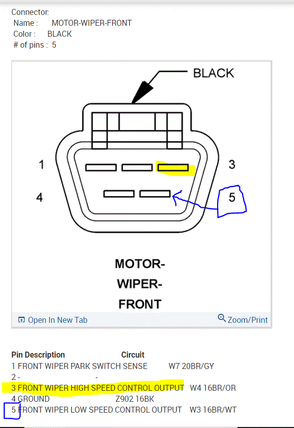 Next, look at pic 2 below. It is what the plug looks like. I highlighted one connector and circled the other. Their purposes are listed at the bottom of the pic. With the plug disconnected, have a helper turn the wipers on low. You should get power to the number 5 pin. Then have them turn it on high and you should have power to pin 3.