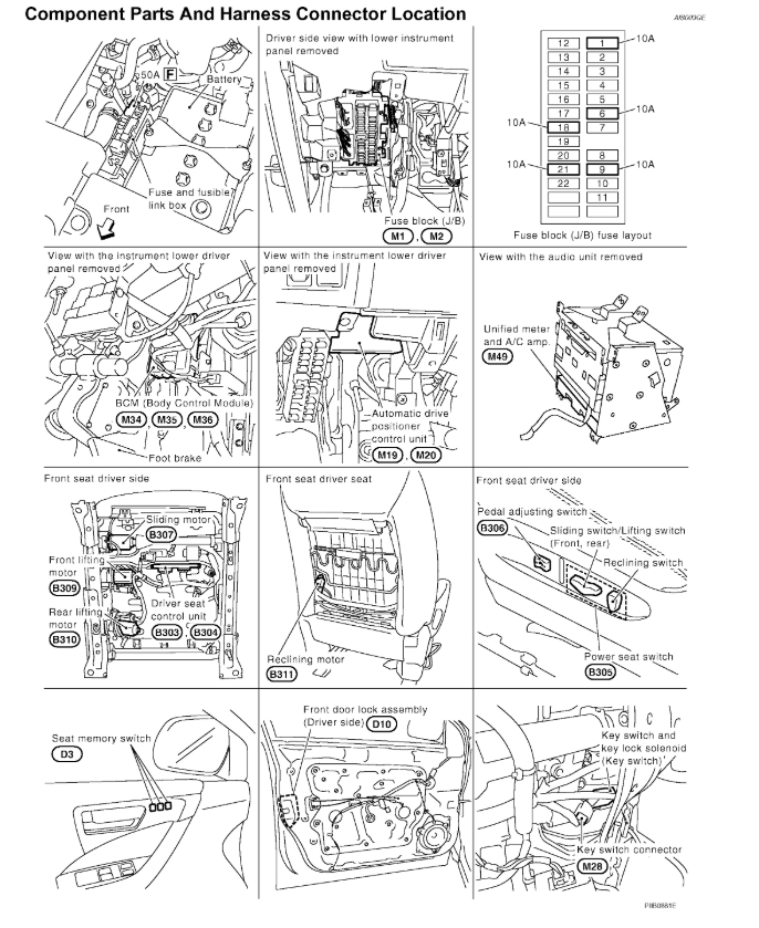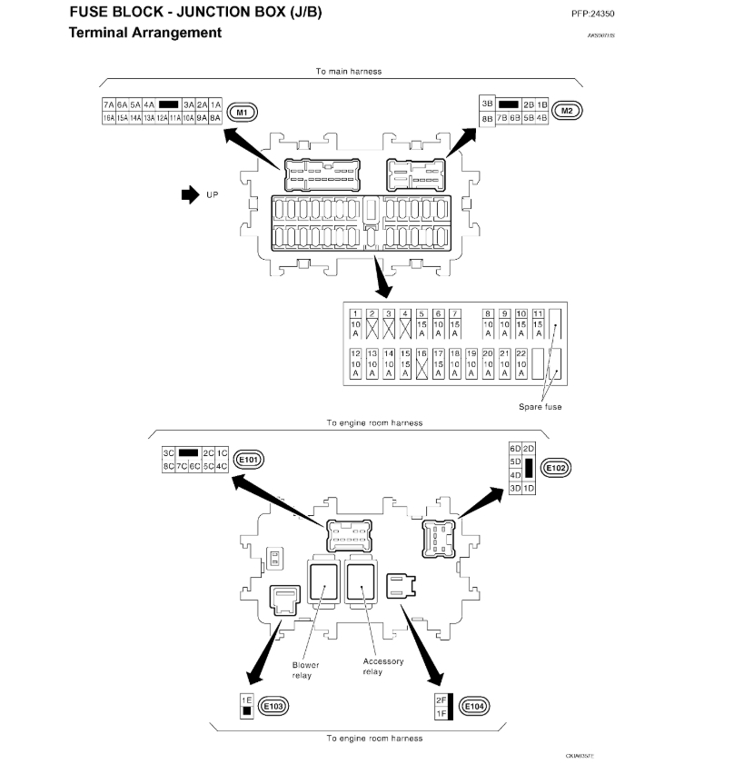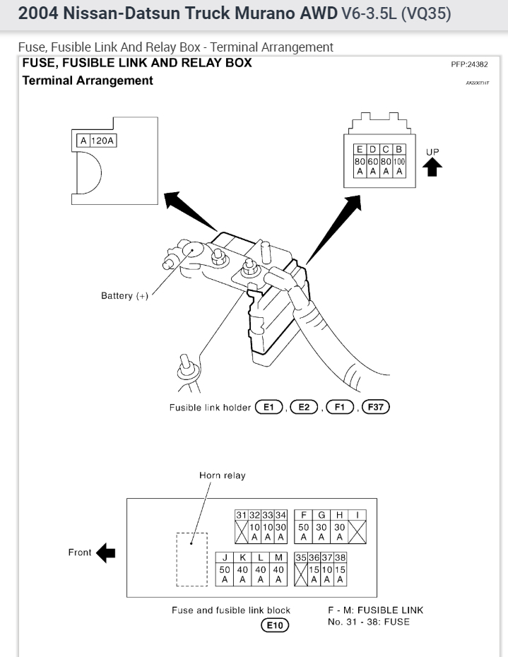 I just like to know the difference in this two models of Murano 2005 SL and 2005 SE. Do both use the same engine fuse box, or the is a difference in the Part numbers? This is very confusing, i have check and realize that i got no 12 volt coming to the ECU Harness F101, on M80 i got just one 12 volt coming. So i felt my problem could be with the fuse box in the engine compartment. What actually happen with this car, the battery terminals were reverse to the opposite direction, which got the ECU/TCM/ main fuse box/ and few other modules fried up, but i have replaced all, BCM is still okay. But no check engine light and P on the instrument Panel.