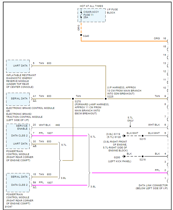 I have 12 volts to the orange wire. I also have approximately 5 volts to the other 2 data wires. But nothing on pin 2 the serial data wire. So I'm getting no communication reading on my scanner.