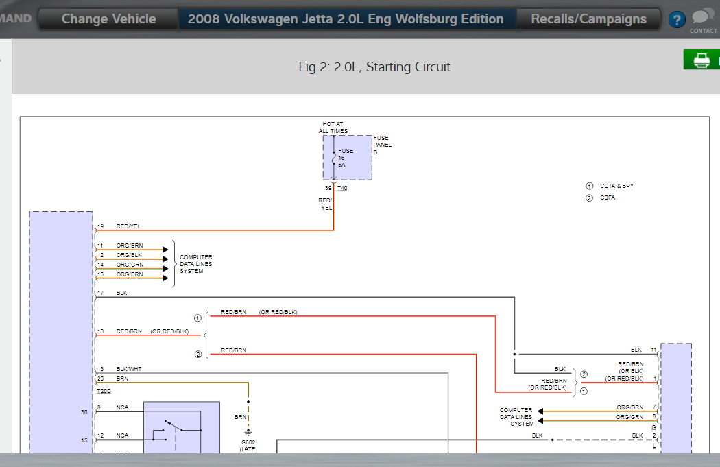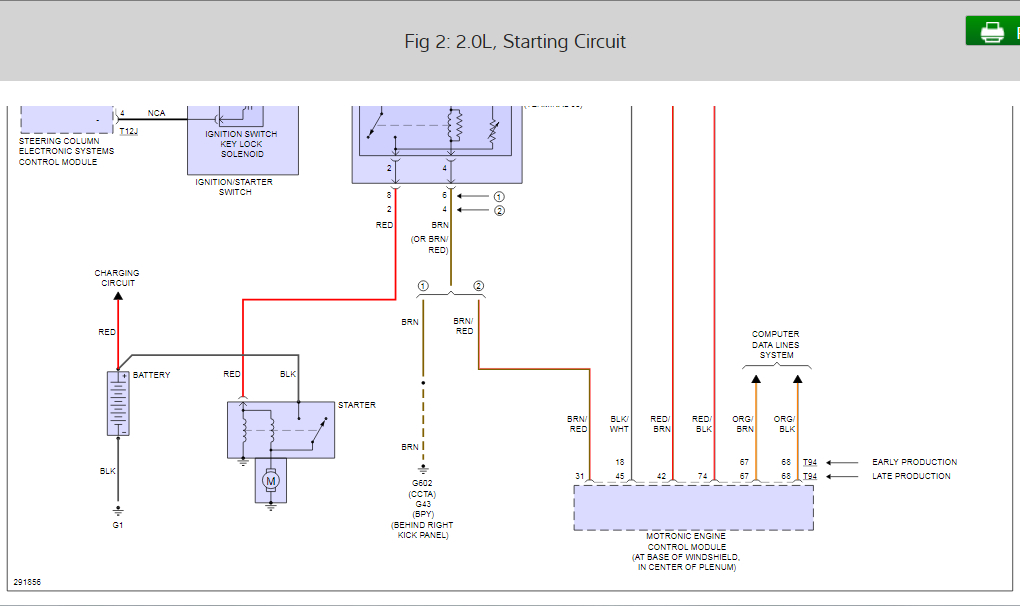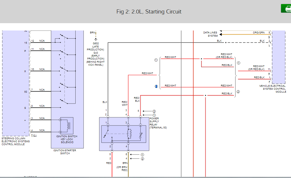 This is a complicated starting circuit. There are a few components that could be the problem here so I will list them all and then we will have to go down the list until we have a winner. Okay, it looks to me like the components probably are the vehicle electrical system control module, steering column electronic systems control module, ignition starter switch, and the power supply relay.