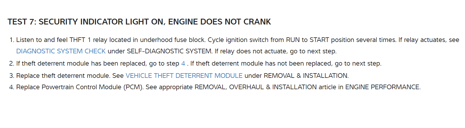 I also could not find a THFT 1 relay anywhere. I looked up a wiring diagram for your vehicle's theft deterrent system and no where on it does it have a relay on it. I have included it in the diagrams down below as well as a factory diagnostic troubleshooting guide for your vehicle's anti theft system from our other resource. Please go through this guide and get back to us with what you are able to find out.