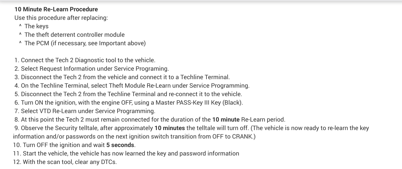 I have tried to communicate with vtd system, have 2 scanners and neither of them are tech 2 I guess, since I cannot justify 1000 up 3500 dollars gm scanners , it seems I am SOL. I did not replace key or tumbler as key turns freely and comes in and out no problem. New transponder installed on key switch and have gone thru relearn procedure for hours. Security light never truns off. Any ideas.