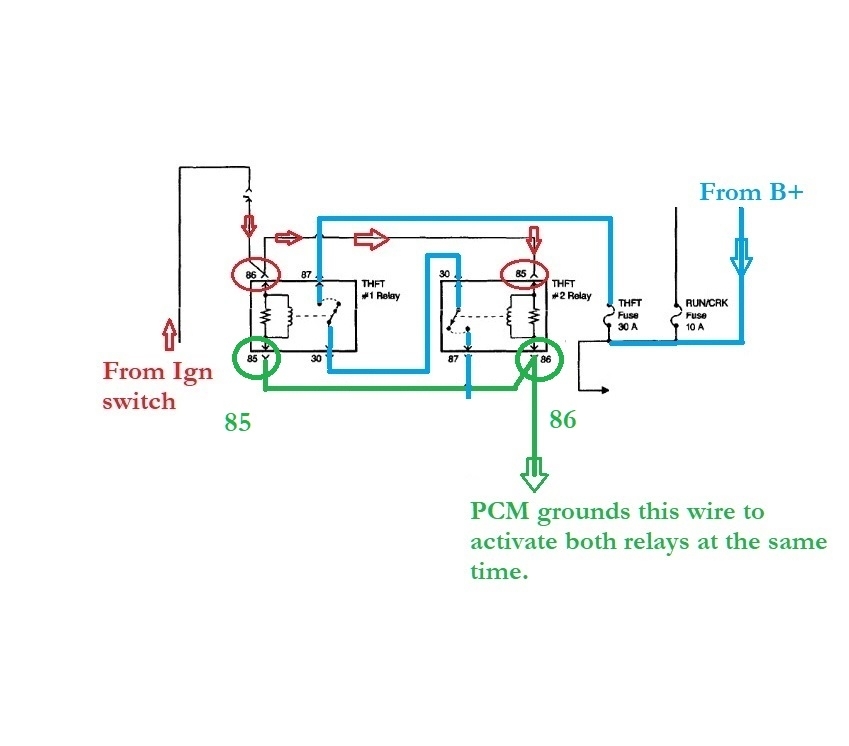 Okay, so, that's interesting, Relay #1 pin 87 gets power (Hot at all times) from the THFT Fuse, Relay 1 pin 86 gets power from the Ignition Switch threw that CRK Fuse 5A, but Relay #2 should also get power on pin 85 from the Ignition switch at the same time as Relay 1.