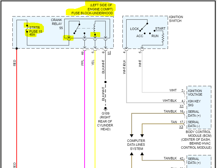 Next, the relay is a 4-pin relay. I attached the schematic below and highlighted the relay. Note there are four wires associated with it.