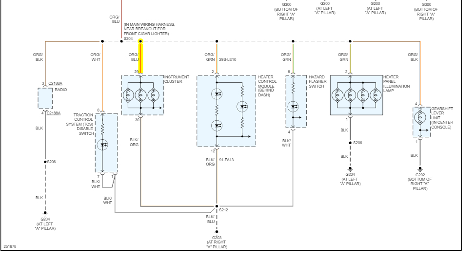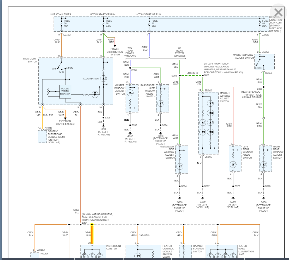 If the dash lights are the only thing not working, then we are pretty confident that we don't have a light switch or fuse issue. This circuit is spliced to many different things, so we need to check power at the cluster and find out if there is voltage. If there is no voltage, then we need to find this splice and just run a new wire to restore the voltage to the cluster.