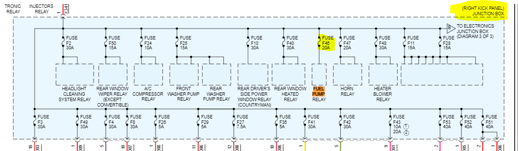 I only found one fuse, #46 for the fuel, 20 amp, good on both sides. Checked rear fuel tank pump on rear passenger side under the seat. No power, only 2 grounds with ignition on, and a 3rd that gives me beeps and .2 oe .3 without stating what it is, and sometimes i touch it and it gives me nothing, maybe this is the signal wire, the 4th gives neither power nor ground. Could not see a relay, diagram in back of cover shows pictures of fuses ok ly, there is only one relay on bottom part of fuse box. Can you find out where the relay is? Has to be a relay or a fuse box issue since am not letting power. No fuel comes out of front, no sound from pump, switched it with my friend's pump and same results.