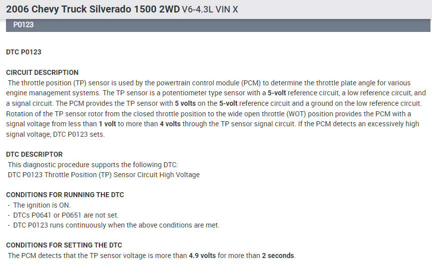 My truck started running rough after a big rain , I had it scanned for check engine light the code that popped up was p0123 which was throttle position sensor high voltage. I changed the TPS and IAC , also changed my air filter and and cleaned the throttle body. still I can't go over 50 MPH unless down hill. I have no take off or passing acceleration. what could be the issue?