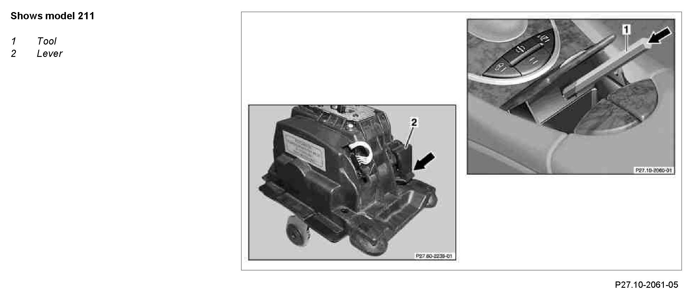 This involves unclipping the stowage compartment in the center console and pressing (arrow) on the lever (2) by inserting a suitable tool (1) through the guide beneath this. The selector lever position "P" lock is released via a bolt in the lock solenoid valve. The selector lever can be shifted through simultaneous actuation of the lever (2) and selector lever from selector lever position "P".
