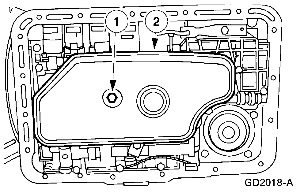 ^ Remove all the transmission fluid pan screws except for two in the front. Loosen the two front transmission fluid pan screws. Pry the rear of the transmission fluid pan down and allow fluid to drain. After fluid is drained, remove the front two transmission fluid pan screws.